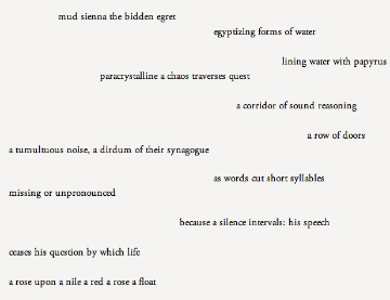 in order to derecinate this text that it might find the quest for form, it was composed via Gematria, a Medieval kabbalistic formula by which letters are translated into numbers. the letters of my hebrew name transformed by a given formula add up to 133. the poem contains 133 stanzas. each stanza is connected to the preceding and following stanza by a counting following this formula:
